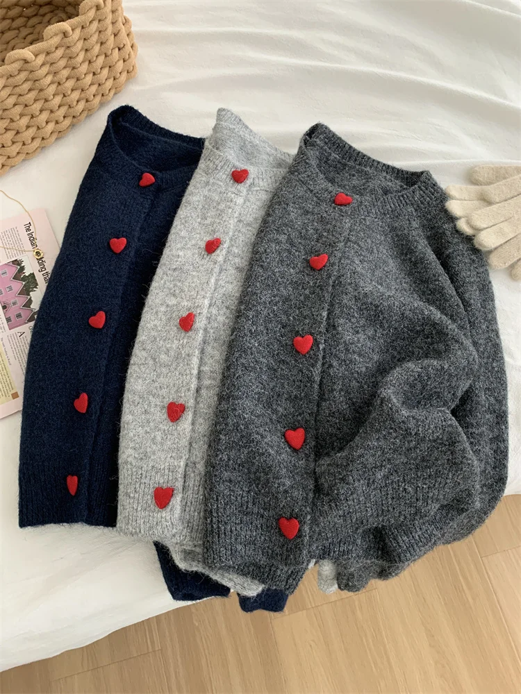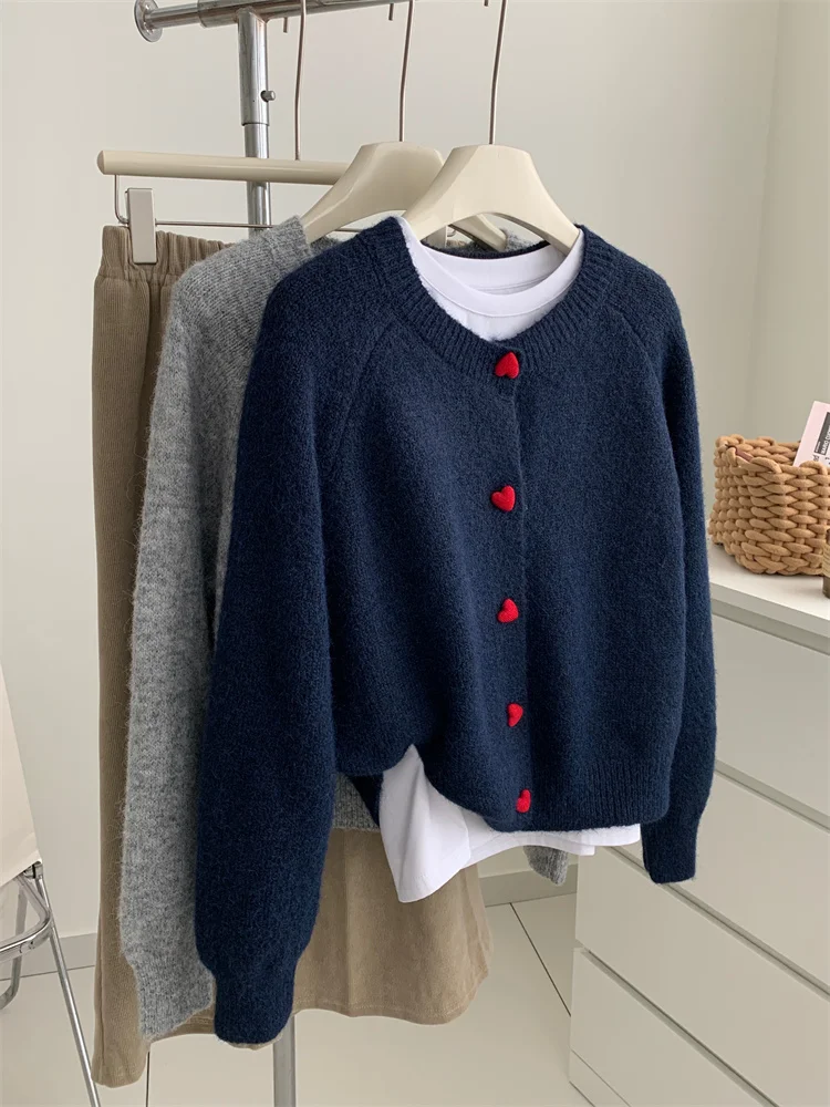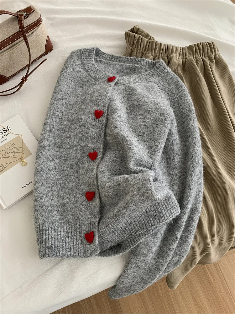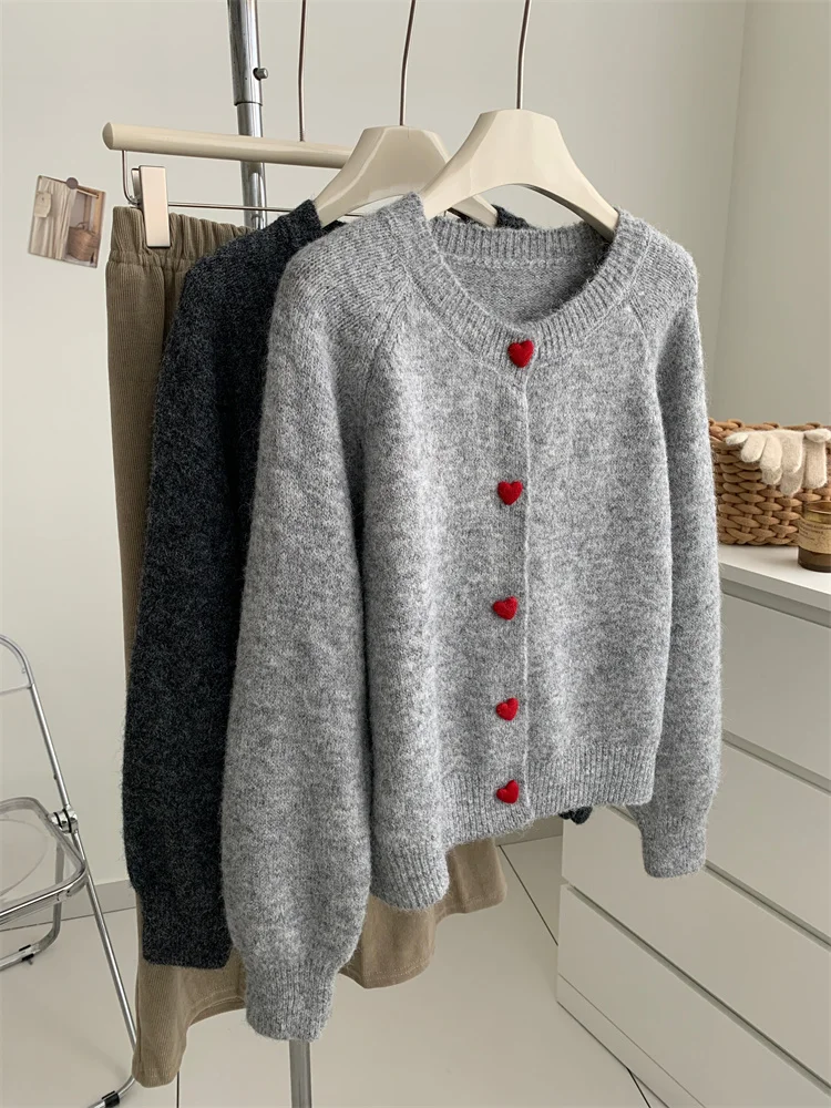 Deep Grey Wool Knitted Cardigan For Women In Autumn Winter, Soft And Sticky, Warm, Love Buckle Shoulder Sleeves