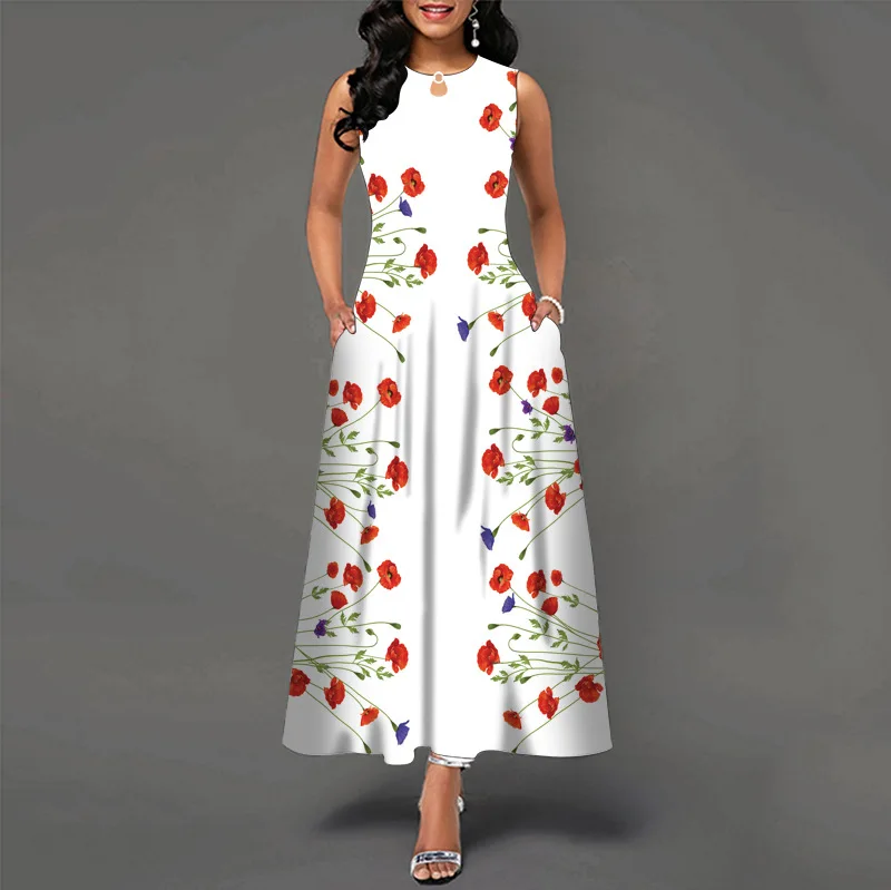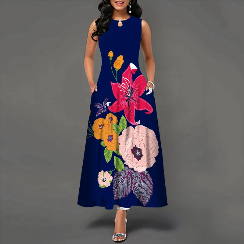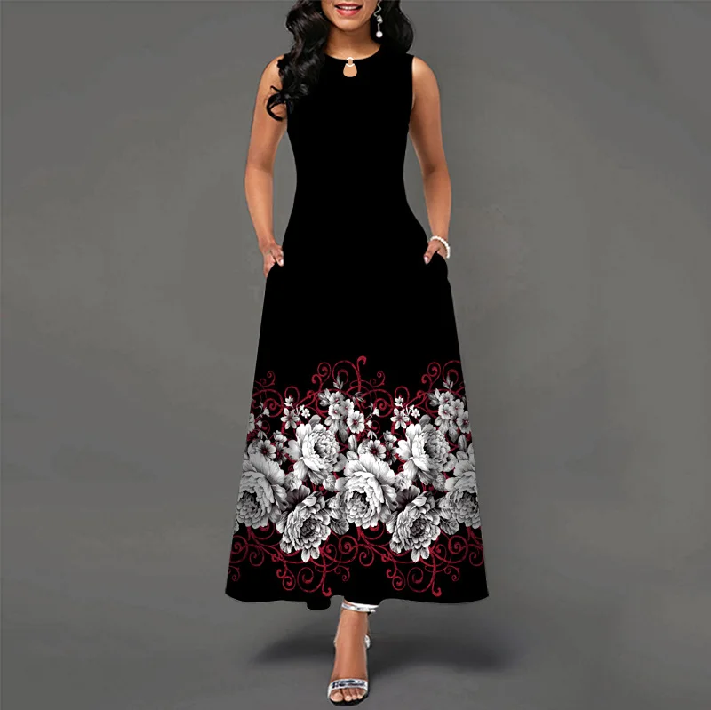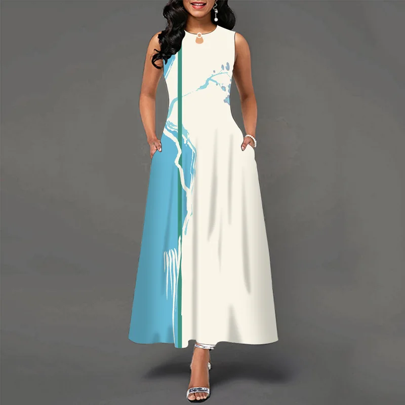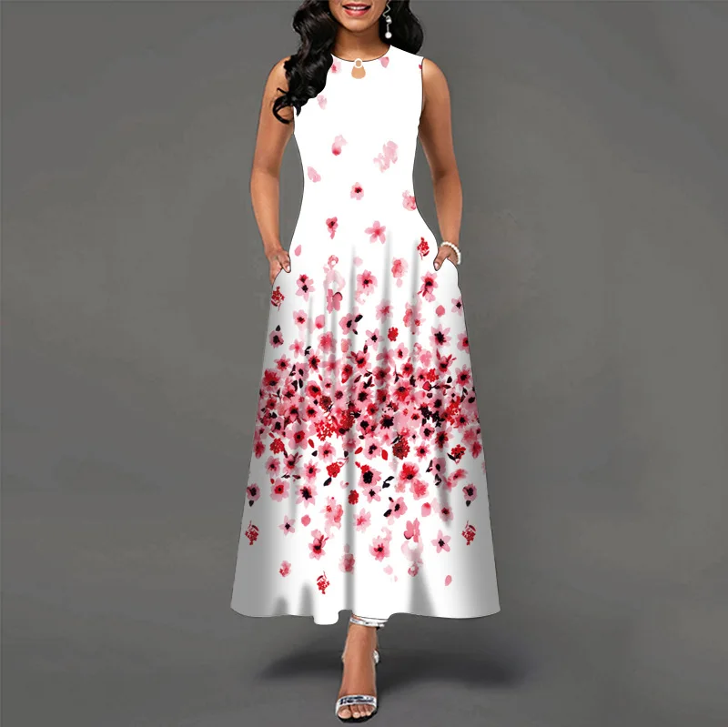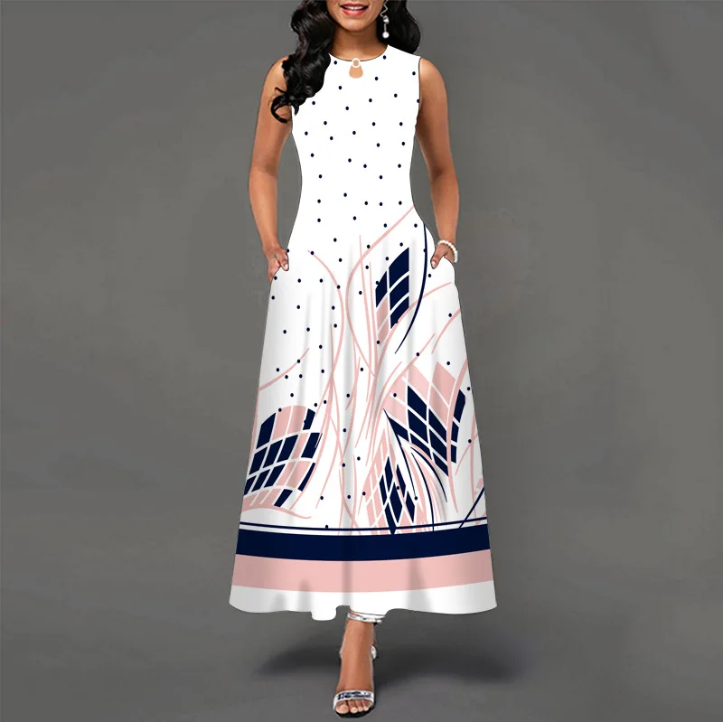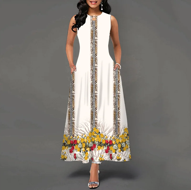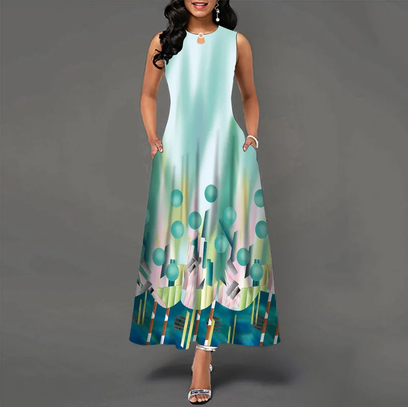 jf23 New Spring/Summer Casual Sleeveless Long Dress Women's V-Neck Printed Dresses Swing Bohemian Retro Dresses A-LINE